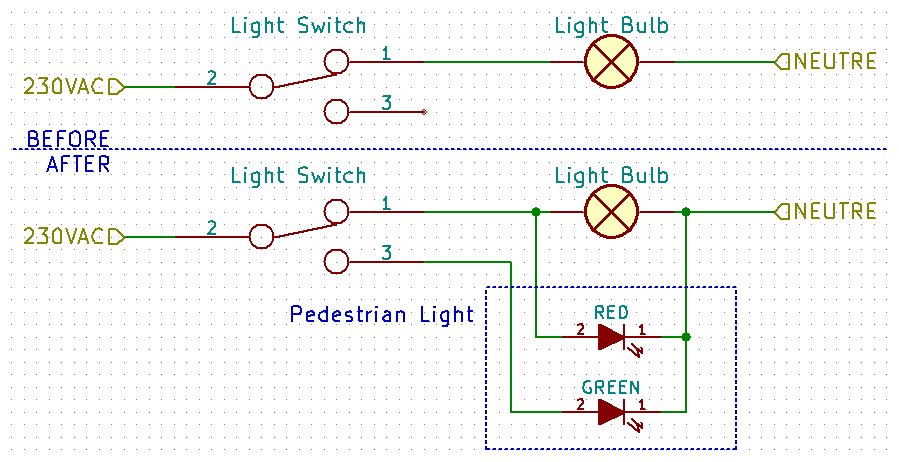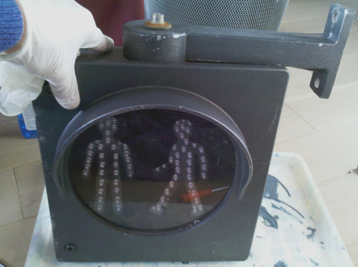 Deux de mes frères m'ont ramené un feux de circulation tricolore abandoné sur le bas côté de la route près d'un chantier sachant que j'aime démonter ces genre d'objets et les détourner de leur fonction première. Quand j'ai vu les différentes parties de ce poteau, j'ai rapidement eu l'idée d'exploiter le feu du passage piéton pour en faire un indicateur de présence pour nos toilettes.